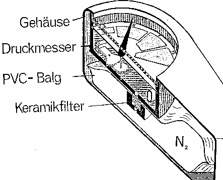 PVC Balg = plastic bag, Keramikfilter = sinter filter, N2 = nitrogen gas